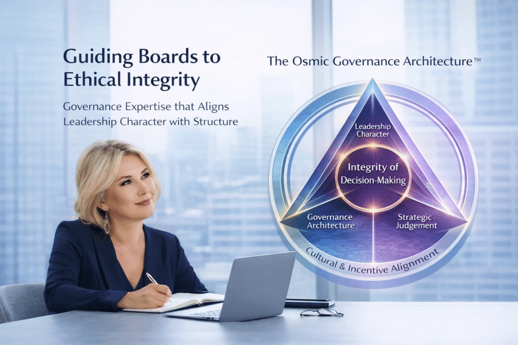 The Osmic Governance Architecture™ is a proprietary behavioural governance framework developed by Sanela Osmic to address precisely this. It explains how leadership character, strategic judgement and governance architecture interact — within environments shaped by culture, incentives and external pressure — to determine whether organizational decisions hold their integrity when it matters most.